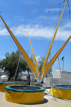 Extrem Amusement commercialise le Bungy Evolutif qui se décline avec différentes options : la forme des trampolines, la hauteur des mâts, l’habillage, jupe de trampoline et oriflamme, proposée en plusieurs couleurs et à votre image.