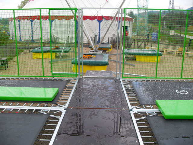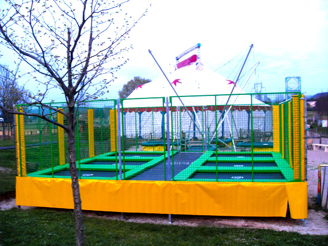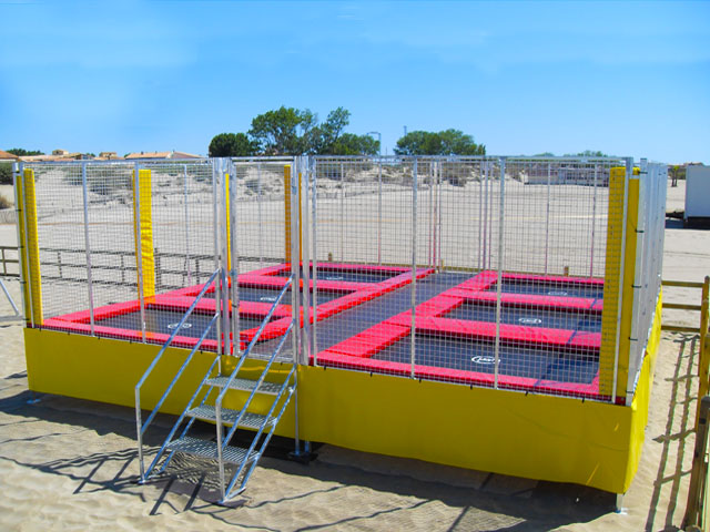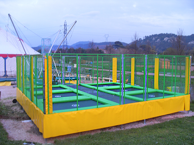 - Nous utilisons des trampolines de 3.00Mx2.30M dont le cadre ne se démonte pas et donc sur lequel les ressorts et la toile reste tendu.